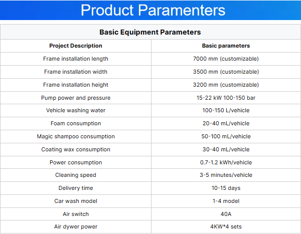 Completes a 360° rotation within 28 seconds, automatically detecting vehicle length and width. High-pressure water (100-150 bar) easily removes dirt.