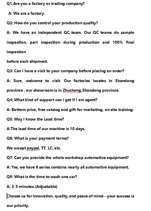 XC Tech automatic car washing machine is based on years of domestic and foreign car washing industry experience research and development and manufacturing,can automatically complete the car wash liquid cleaning,high bubble washing,high pressure water cleaning,water wax,air drying,is truly a set of cleaning,air drying in one of the intelligent car washing equipment.